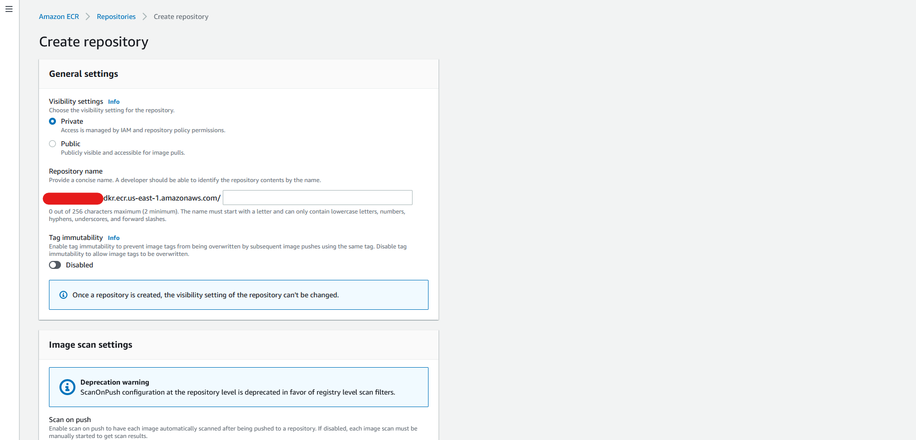 우리는 가볍게 테스트만 진행할거라 외부에 이미지를 공개할 필요는 없기 때문에 Private으로 생성해주도록 합니다.
