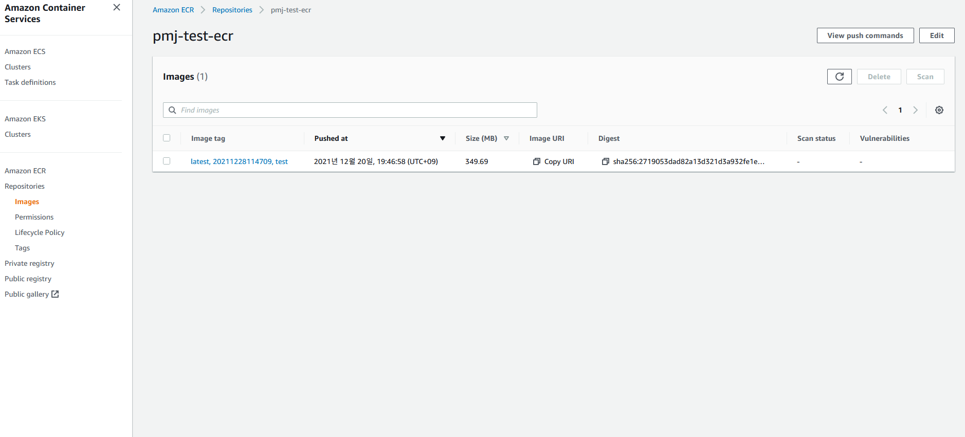 ECR로 돌아갔을때 위와 같이 이미지가 생성되었다면 성공적으로 업로드 된겁니다.