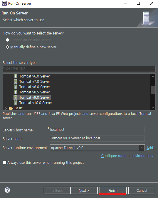 Tomcat 버전에 맞게 선택해 주신 후 Finish 클릭