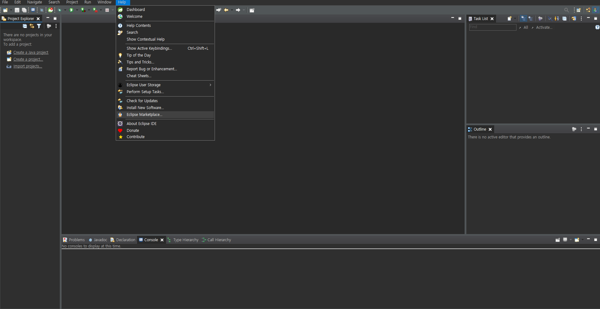 IDE 상단 메뉴바에서 Help -> Eclipse Marketplace 클릭