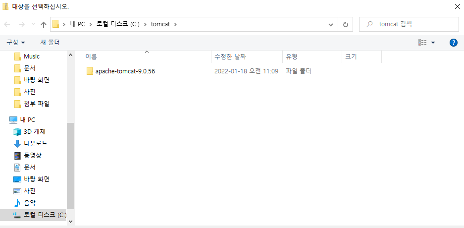 그 다음 압축을 풀어야하는데, 필자의 경우 C 드라이브 안에다 tomcat이라는 폴더를 하나 만들고 그 안에다가 압축을 풀어줬습니다.