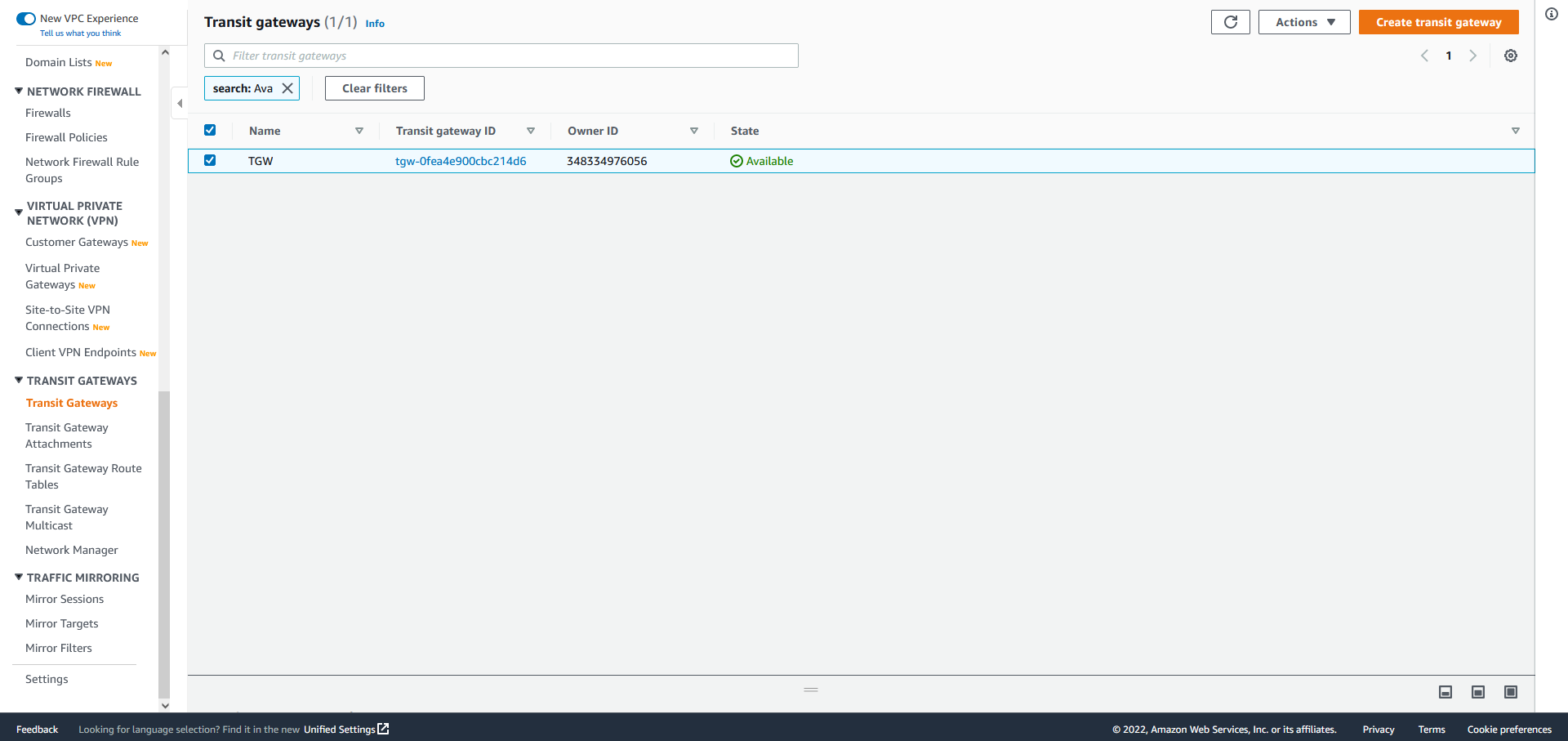 모든 설정을 마쳤다면 하단에 Create transit gateway 버튼을 눌러 Transit Gateway를 생성해 줍니다.