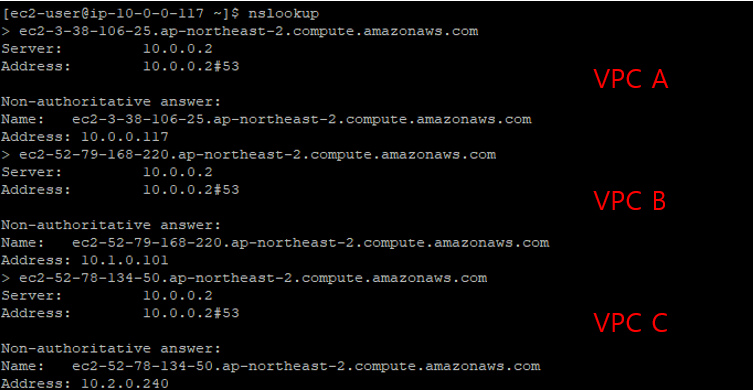 또한 위에서 Transit Gateway를 생성할 때 DNS suppport 옵션을 활성화 해주었기에 인스턴스의 DNS가 Private IP를 가르키는 것을 보실 수 있습니다.