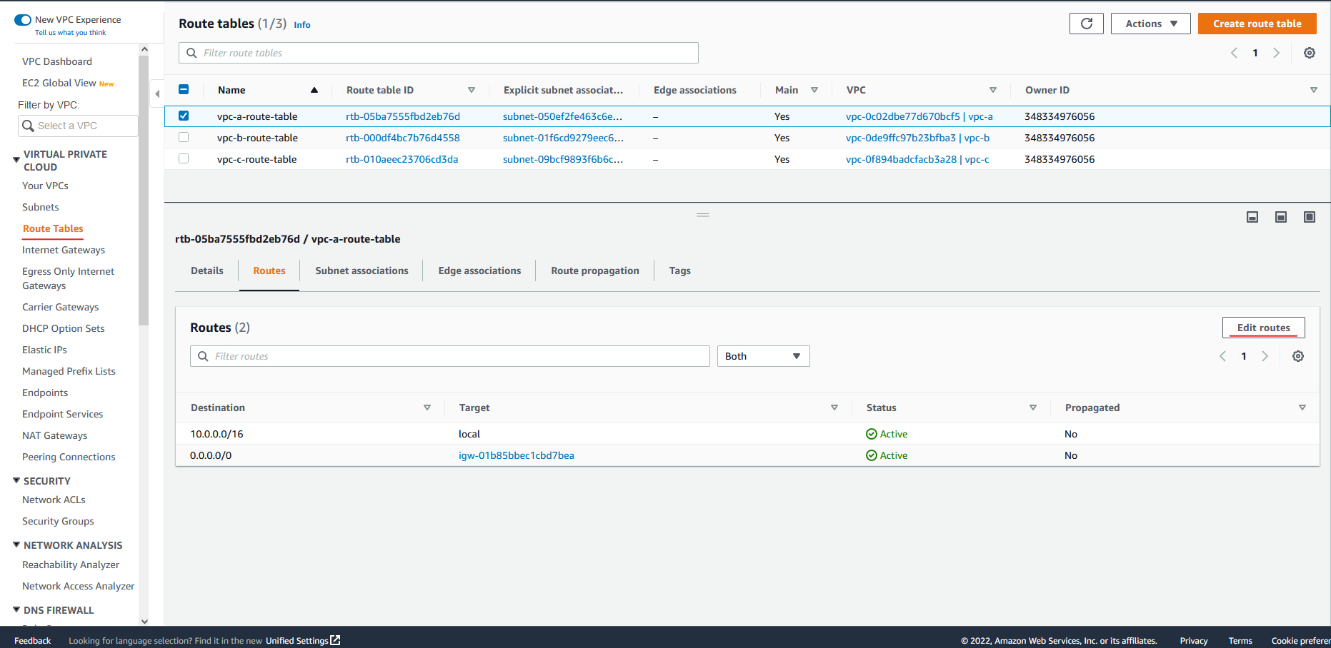 Routes 메뉴를 선택한 후 Edit routes 버튼을 눌러 라우팅 테이블을 편집합니다.