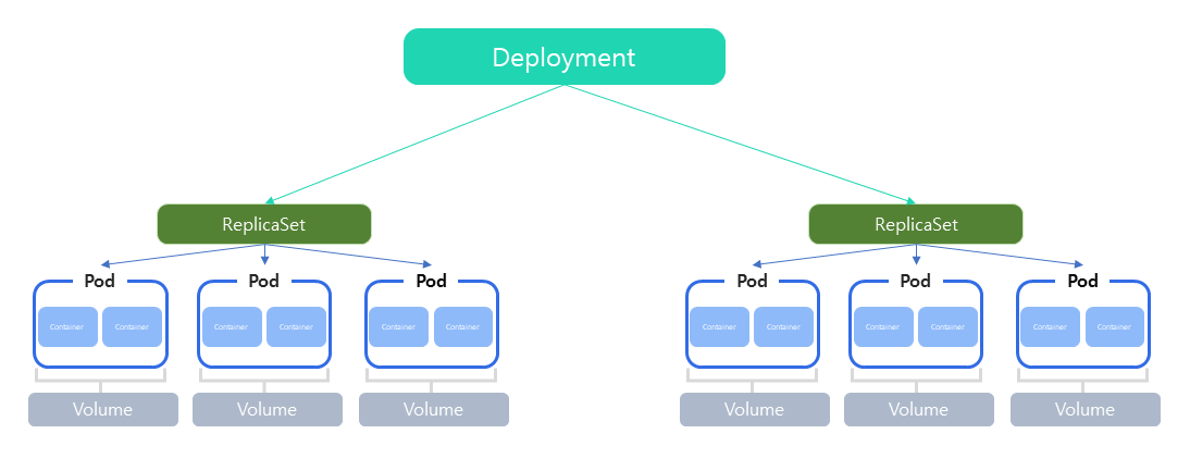 Deployment는 ReplicaSet의 상위 개념으로, Pod와 ReplicaSet에 대한 배포를 관리합니다. 운영 중에 어플리케이션의 새 버전을 배포해야하거나 부하가 증가하면서 ReplicaSet을 추가하는 등 여러 가지 동작을 Deployment로 관리할 수 있습니다. Deployment는 배포에 대한 이력을 관리하는데 만약 배포한 새버전의 문제가 생긴 경우 Deployment를 통해 쉽게 이전 버전으로 롤백할 수 있습니다. 쿠버네티스로 서비스를 운영하는 상황이라면 ReplicaSet만으로 운영하기 보다는 대부분 Deployment단위로 Pod와 ReplicaSet을 관리하여 운영합니다.
