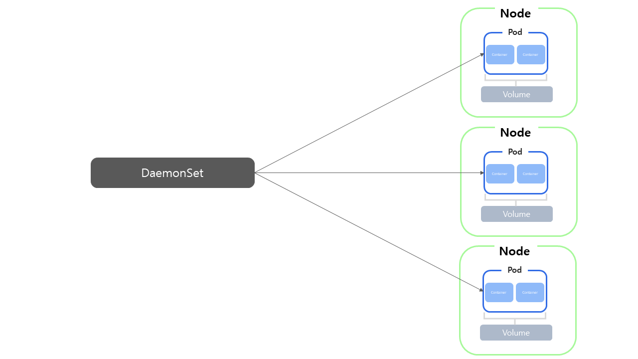 DaemonSet역시 Deployment와 유사하게 Pod를 생성하고 관리하지만, 전체 노드(서버)에서 항상 실행되어야 하는 특정 Pod를 실행할 때 사용합니다. 예를 들어 각 노드의 모니터링 환경을 구성하기 위해 노드 마다 로그 수집용 Pod를 실행해야 하는 경우 DaemonSet을 사용하여 Pod를 관리하면 노드가 추가되어도 로그 수집용 Pod가 자동으로 노드에 추가되어 좀 더 쉽게 모니터링 환경을 구축할 수 있습니다.