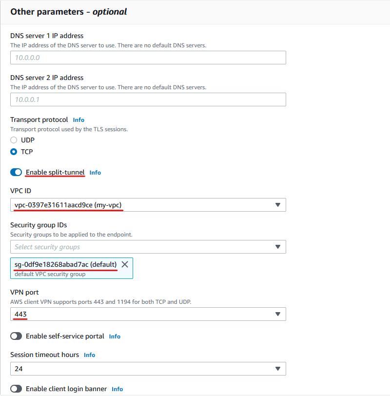 VPC와 보안 그룹을 지정해 주신후 분할 터널(split tunnel) 옵션을 활성화 해줍니다. 443 포트(TCP)를 지정해 주었으니 보안 그룹에 해당 포트에 대한 인바운드 규칙이 허용되어있어야 합니다.