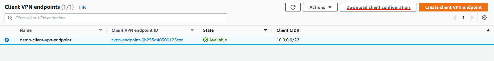 위에서 생성한 Client VPN Endpoint를 선택하고 오른쪽 상단에 Download client contiguration 버튼을 클릭하여 .ovpn 파일을 다운로드 합니다.