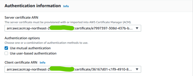 위 ACM에서 발급받은 서버 인증서와 클라이언트 인증서를 지정해 줍니다.