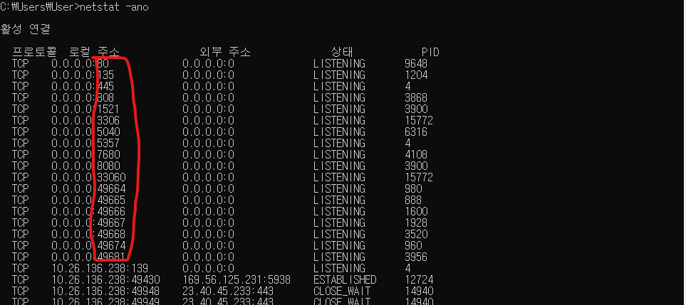 IP주소:포트번호 보시다시피 콜론(:) 뒤에 붙은 것들이 현재 사용하고 있는 포트 번호입니다.