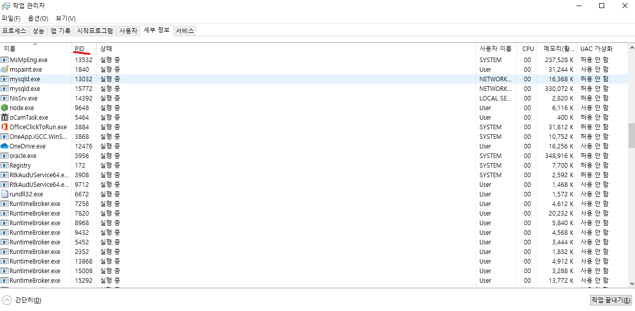 PID는 작업관리자를 통해 확인가능합니다.