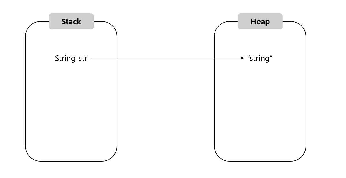 일단 변수는 Stack 영역에 할당 될것이고, new String으로 생성된 문자열값이 Heap영역의 메모리 공간을 할당받아 str이라는 변수가 그 메모리주소를 가르키고 있을것이다. 이를 다른 말로 참조라고도 한다.